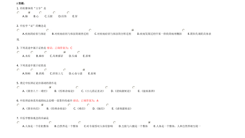 A型题:1.有机整体的“主宰”是A.脑B.心C.五脏D.经络E.肾2.中医学“证”的概念是A.疾病的症状与体征B.对疾病症状与体征的调查过程C.对疾病症状与体征的分析过程D.疾病发展过程中某一阶段的病理概括E.阴阳失调的具体表现3.下列表述中属于证的是错误:正确答案为:CA.水痘B.麻疹C.风寒感冒D.头痛E.恶寒4.下列表述中属于症的是A.肺痈B.消渴C.肝阳上亢D.心血亏虚E.恶寒5.奠定中医辨证论治基础的著作是A.《黄帝八十一难经》B.《伤寒杂病论》C.《小儿药证直诀》D.《诸病源候论》E.《温病条辨》6.中医理论体系形成的标志是哪一部著作的成书错误:正确答案为:AA.《黄帝内经》B.《...