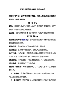 2020最新药理学知识点归纳总结亲爱的考生们,由于考试即将临近,我呕心沥血总结的知识点希望对大家有所帮助!第一章绪论药物:是指可以改变或查明机体的生理功能及病理状态,用于预防、诊断和治疗疾病的物质。药理学:研究药物与机体(含病原体)相互作用规律的学科第二章药效学药物效应动力学(药效学):是研究药物对机体的作用及作用机制的生物资源科学。药物作用:是指药物对机体的初始作用,是动因。药理效应:是药物作用的结果,是机体反应的表现。治疗效果:也称疗效,是指药物作用的结果有利于改变病人的生理、生化功能或病理过程,使患病的机体恢复正常。对因治疗:用药目的在于消除原发致病因子,彻底治愈疾病。对症治疗:用药目的...