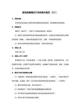 新冠病毒核酸混采检测操作规范 进为一步提升核酸检测能力和效率,规范新冠病毒混采检测工作,针对新冠病毒核酸混采检测技术,制定本操作规范。 一、样本采集耗材规格 (一)病毒采集管。 管帽和管体应当为聚丙烯材质,螺旋口可密封,松紧适度。管体透明,可视度好。试管外径(14.8±0.2)mm×(100.5±0.4)mm,管帽外径(15.8±0.15)mm,高度(12.5±0.5)mm。容量企业定标10ml,内含6ml胍盐或其他有效病毒灭活剂的保存液。保存液应当带有易于观察、辨识的颜色(如粉红色),并保持一定的流动性,方便取样。 (二)采集拭子。 宜选用聚酯、尼龙等非棉质、非藻酸钙材质的拭子...