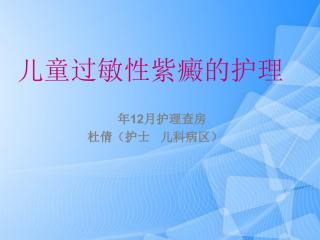 儿童过敏性紫癜的护理年12月护理查房杜倩(护士儿科病区)病情介绍患儿,谭皓,男,8岁11月,于年11月20日01点00分抱入病房,其母代诉:“双下肢皮疹2天,加重伴踝关节肿痛半天,腹痛半天”护理查体:T37°CP92次/分R22次/分BP100/66mmHg病儿神智清楚,急性面容,面色口唇红润,双下肢及双手腕皮肤可见大小不等暗红色瘀斑、瘀点,部分呈紫色,局部高出正常皮肤。压之不退色,双侧对称分布,双侧踝关节外侧可见瘀斑,双侧关节肿痛,触痛明显,腹痛,肌紧张。血常规:﹪,L:18.8﹪,HGB:133g/LPLT:275x10˜9/L血生化:。大便常规+隐血未见明显异常;尿常规未见明显异常。辅助...