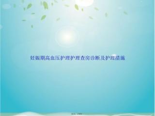 妊娠期高血压护理查房摘要本次查房旨在让大家掌握妊娠期高血压护理诊断及措施了解相关知识。妊娠期高血压多因精神紧张、受刺激致中枢神经紊乱在妊娠期出现一过性高血压、蛋白尿等症状分娩后消失但严重危及母婴健康是孕产妇及围生儿死亡重要原因。其高危因素包括年轻或高龄初产妇、子宫张力过高、有慢性病史、寒冷季节、严重营养不良、体型矮胖、有家族史等。病情分类上子痫前期分轻重度轻度血压14090mmHg重度血压160110mmHg且伴多脏器受损。子痫有产前、产时、产后之分。护理诊断涉及组织灌注量改变、体液过多、有受伤危险、焦虑、潜在并发症等。处理原则方面妊娠期高血压要加强产检、注意休息等;子痫前期需住院解痉、镇静等并适时终止妊娠。常用药物有解痉的硫酸镁、镇静的地西泮等、降压的肼屈嗪等。硫酸镁用药前要确定膝反射、呼吸、尿量正常准备好葡萄糖酸钙注射液应对毒性反应。