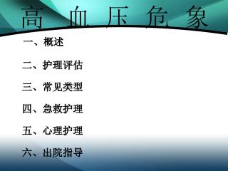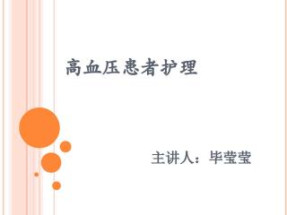 主讲人毕莹莹介绍了我国高血压病发展趋势及护理要点。高血压是最常见的慢性病之一也是心脑血管病主要危险因素我国患病率呈增长趋势成年人血压患病率已超25且存在“三高三低”现状。原发性高血压通常简称为高血压病因涉及遗传、饮食、精神、气候及环境等多方面。临床表现上患者常有头痛、头晕等症状体征为血压升高且可能引发脑血管、心脏、肾脏等多种并发症。高血压急症指血压突然显著升高超过180120mmHg伴有重要靶器官功能不全。实验室检查包括常规和特殊检查。治疗原则为降低血压预防并发症。护理问题涉及疼痛、活动无耐力、有受伤的危险、知识缺乏及潜在并发症。护理措施包括减少头痛因素、避免受伤、预防直立性低血压、定期监测血压以及高血压急症时的绝对卧床、保持呼吸道通畅等。
