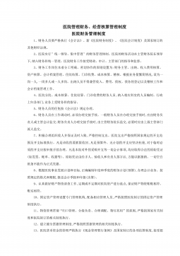 医院管理财务、经营核算管理制度医院财务管理制度1、财务人员要严格执行《会计法》、新《医院财务制度》、《医院会计制度》及国家制订的其他财经法规。2、医院实行″统一领导、集中管理″的财务管理体制。医院的财务活动在主管财务院长领导下,纳入财务科统一管理。医院财务工作接受财政、审计、主管部门的指导和监督。3、财务工作岗位本着分工明确、密切协作的原则设置为:财务主管、出纳、收入费用核算、资产核算、会计档案管理、住院结算、门诊收费、成本核算、稽核。根据业务量繁简情况,设为一岗一人,一岗多人或一人多岗。出纳人员不得兼管收入、费用、债权、债务的登记以及稽核工作和会计档案管理工作。4、医院分院、成本核算、住院结...