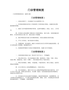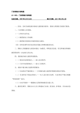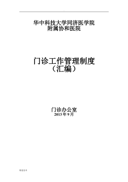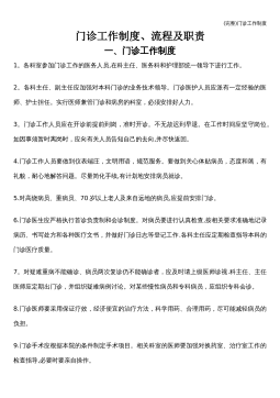 (完整)门诊工作制度门诊工作制度、流程及职责一、门诊工作制度1。各科室参加门诊工作的医务人员,在科主任、医务科和护理部统一领导下进行工作。2。各科主任、副主任应加强对本科门诊的业务技术领导。门诊医护人员应派有一定经验的医师、护士担任。实行医师兼管门诊和病房的科室,必须安排好人力。3。门诊工作人员应在开诊前提前到岗,准时开诊。不无故迟到早退。在工作时间应坚守岗位。如因事须暂时离岗时,应向有关人员告知自己的去向,并尽快返回。4.门诊工作人员要做到仪表端庄,文明用语,规范服务。要做到关心体贴病员,态度和蔼,有礼貌,耐心地解答问题。尽量简化手续,有计划地安排病员就诊。5.对高烧病员、重病员、70岁以上...