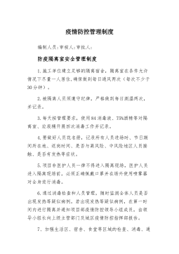 疫情防控管理制度编制人员:审核人:审批人:防疫隔离室安全管理制度1.施工单位建立足够的隔离宿舍,隔离室在条件允许情况下尽量一人居住,确保做到每日通风两次(每次不少于30分钟)。2.被隔离人员须遵守纪律,严格做到每日测温两次,并记录。3.每天按管理要求,使用84消毒液、75%酒精等对隔离室、垃圾桶开展四次消毒工作并记录。4.要做好人员花名册,记录所有人员进场时防日期间所在地、返岗时间、是否与高风险、中风险地区人员接触、是否有发热等症状。5.项目非医护人员一律不得进入隔离现场,医护人员进入隔离现场前,必须正确佩戴口罩并在场外使用喷雾器对全身进行消毒。6.通过消毒检查和人员管理,随时监测全体人员是否...