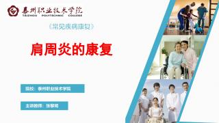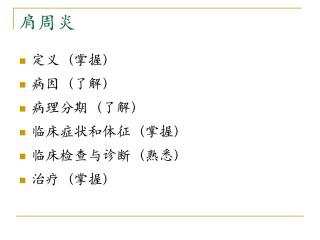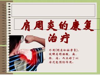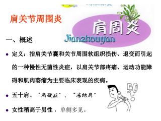 肩关节周围炎一、概述定义:指肩关节囊和关节周围软组织损伤、退变而引起的一种慢性无菌性炎症,以肩关节部疼痛、运动功能障碍和肌肉萎缩为主要临床表现的疾病。五十肩、“肩凝症”、“冻结肩”女性稍高于男性,单侧多见。起病往往无明显病因。常为单侧发病,也偶有双侧同病者,肩部疼痛范围比较广泛,常波及三角肌、肱二头肌、冈上肌、冈下肌、肩胛下肌、小圆肌乃至胸小肌、胸大肌等肩关节周围的肌肉、肌踺和韧带。肩周炎并非肩关节周围不明原因肩痛的统称,较为准确的命名应该是“冻结肩”或“粘连性关节囊炎”。好发于40岁~70岁的中老年人,大约有2%~5%的发病率,女性较男性多见。最常见的与肩周炎相混淆的疾病有“肩关节周围撞击症...