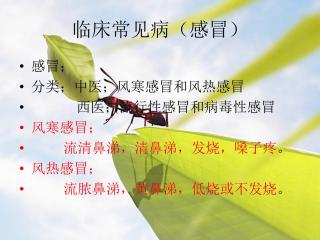 感冒中医内科教研室概说病因病机诊查要点辨证论治预防调护结语临证备要复习思考题[概说]-概念感冒是感受触冒风邪所导致的常见外感病。临床特征:鼻塞、流涕、喷嚏、咳嗽、头痛、恶寒、发热、全身不适。[概说]-发病特点发病季节:四时皆有,冬春为多。病有轻重之别,时行感冒尤重。轻——感受当令之气,通称“伤风”、“冒风”。因感寒所致者又称“冒寒”。重——感受非时之邪,亦称“重伤风”。因风寒所致者,又叫“小伤寒”。时行感冒——感受时行病毒,有较强的传染性,并可引起广泛的流行。属感冒之重证。病邪少有传变,但亦可变生他病。[概说]-沿革《内经》首提本病的主因及主症《素问·骨空》:“风从外入,令人振寒,汗出头痛,身...