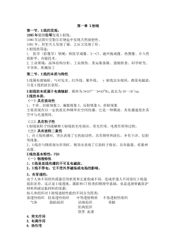 第一章X射线第一节、X线的发现:1895年德国伦琴发现X射线。1896年法国贝克勒尔在钠盐中发现天然放射性。1901年,居里夫人发现了镭,之后又发现了钋。X射线的用途:1.医学(影像学)领域:核医学成像、X—CT、磁共振成像、热图像、介入性放射学、内镜技术。2.工业领域:晶体结构分析、工业探伤、货运集装箱、透视检查、科学研究、半导体、机械加工第二节、X线的本质与特性X线属电离辐射,与可见光、红外线、紫外线、γ射线完全相同,都是电磁波,只是X线的波长很短。X射线的本质属于电离辐射。频率为3*1016——3*1020Hz,波长为10--10-3nm.X线的本质:(一)具有波动性1、干涉、衍射现象2...