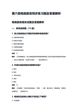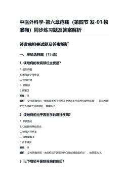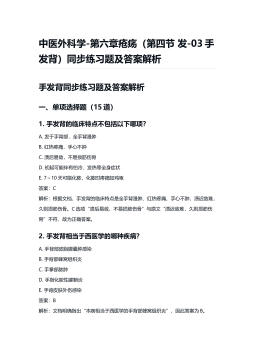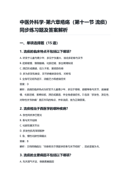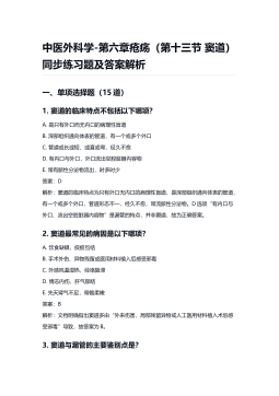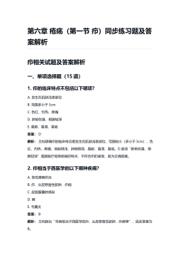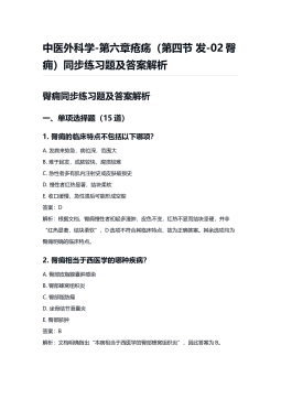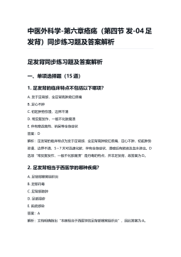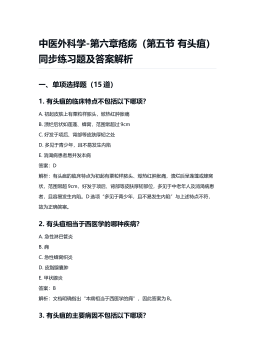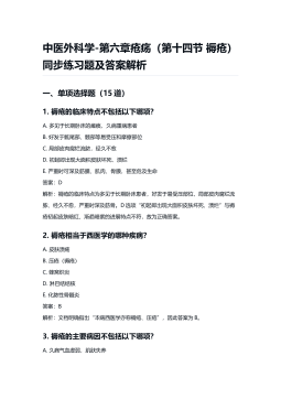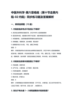 中医外科学-第六章疮疡(第十节走黄内陷-02内陷)同步练习题及答案解析一、单项选择题(15道)1.内陷的临床特点不包括以下哪项?A.多由有头疽等阳证疮疡并发,多见于老年人或消渴病患者B.疮顶忽然内陷,或脓腐未净而干枯无脓,或脓净疮面忽变光白板亮C.伴邪盛热极、正虚邪盛或阴阳两竭的全身危急证候D.肿势隆起,根脚收束,脓水稠厚,预后良好E.按病程阶段分为火陷、干陷、虚陷三种类型答案:D解析:内陷的临床特点为多由有头疽等阳证疮疡并发,多见于老年人或消渴病患者,疮顶内陷、脓腐异常,伴全身危急证候,分火陷、干陷、虚陷三型。D选项“肿势隆起、根脚收束、脓水稠厚”是阳证疮疡的正常表现,并非内陷,故为正确答案...