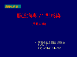 肠道病毒71型感染(手足口病)•陕西省勉县医院郑新杰E-Mail:zxj.236@163.com病毒性疾病1手足口病手足口病(Hand-foot-mouthdisease,HFMD)是肠道病毒引起的常见传染病之一多发生于5岁以下的婴幼儿发热和手足、口腔等部位的皮疹、溃疡可引起心肌炎、肺水肿、无菌性脑膜脑炎等致命性并发症无合并症的患儿预后良好,一般5~7d自愈2008年5月2日,国家卫生部正式将手足口病列入法定丙类传染病进行管理。2病原学能引起HFMD的病原型别很多,均属于微小核糖核酸病毒科(Picorna)、人肠道病毒属,其型别有CoxA5、10、16、19型及EV71型和新肠...