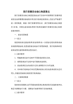 医疗质量安全核心制度要点医疗质量安全核心制度是指在诊疗活动中对保障医疗质量和患者安全发挥重要的基础性作用,医疗机构及其医务人员应当严格遵守的一系列制度。根据《医疗质量管理办法》,医疗质量安全核心制度共18项。本要点是各级各类医疗机构实施医疗质量安全核心制度的基本要求。一、首诊负责制度(一)定义指患者的首位接诊医师(首诊医师)在一次就诊过程结束前或由其他医师接诊前,负责该患者全程诊疗管理的制度。医疗机构和科室的首诊责任参照医师首诊责任执行。(二)基本要求1、明确患者在诊疗过程中不同阶段的责任主体。2、保障患者诊疗过程中诊疗服务的连续性。3、首诊医师应当作好医疗记录,保障医疗行为可追溯。4、非本医...