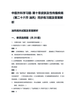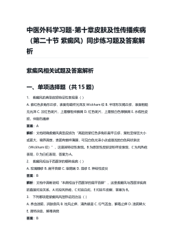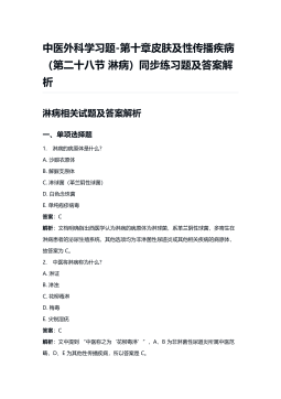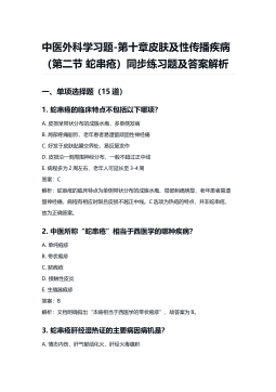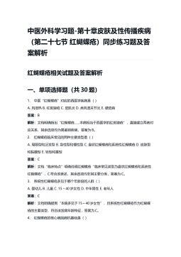 中医外科学习题-第十章皮肤及性传播疾病(第二十七节红蝴蝶疮)同步练习题及答案解析红蝴蝶疮相关试题及答案解析一、单项选择题(共30题)1.中医“红蝴蝶疮”对应的西医学疾病是()A.风湿热B.红斑狼疮C.皮肌炎D.类风湿关节炎E.硬皮病答案:B解析:文档明确指出“红蝴蝶疮……本病相当于西医学的红斑狼疮”,直接建立两者对应关系,其余选项均为需鉴别疾病,答案为B。2.红蝴蝶疮临床常见的两种主要类型是()A.局限型和泛发型B.急性型和慢性型C.盘状红蝴蝶疮和系统性红蝴蝶疮D.皮肤型和黏膜型E.轻型和重型答案:C解析:文档“临床特点”明确说明红蝴蝶疮“临床常见类型为盘状红蝴蝶疮和系统性红蝴蝶疮”,C符合该...