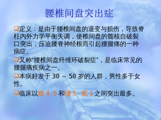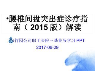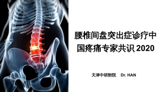腰椎间盘突出症诊疗中国疼痛专家共识2020天津中研附院Dr.HAN背景腰椎间盘突出症(LDH)是临床常见病和多发病,严重危害病人身心健康。LDH是指腰椎间盘发生退行性病变后,纤维环部分或全部破裂,髓核单独或者连同纤维环、软骨终板向外突出,刺激或压迫窦椎神经和神经根引起的以腰腿痛为主要症状的一种综合征。定义LDH是临床常见病和多发病,好发于成年人。至少95%的LDH发生于L4-5和L5-S1。国外相关研究显示LDH发病率大约2%~3%,而35岁以上的男性发病率约4.8%,女性约2.5%。流行病学1.退行性改变:腰椎间盘退行性改变是LDH发生的基本因素,包括纤维环和髓核含水量减少,髓核失...